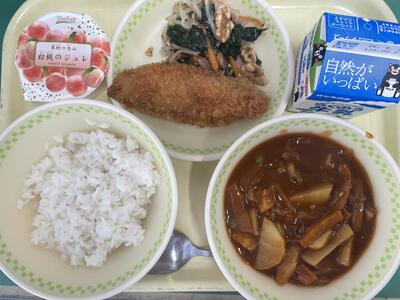 ハヤシライス、サーモンフライ、くるみ和え、白桃ジュレ