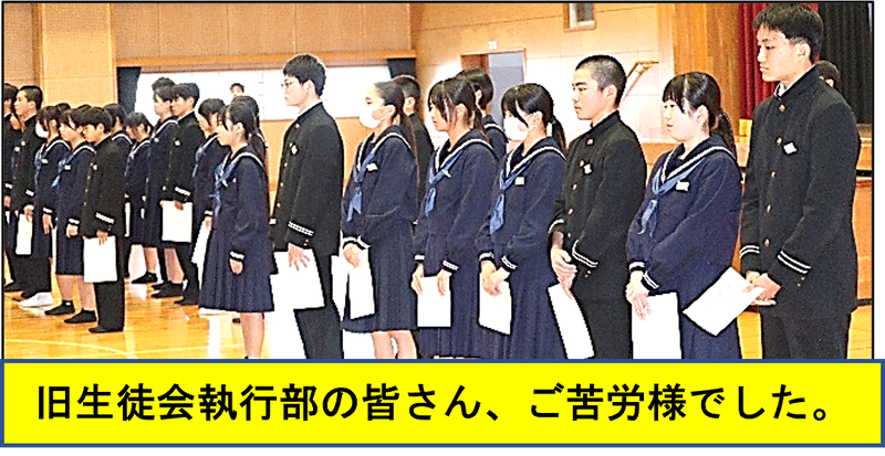 1月13日、生徒会の旧執行部と新執行部の引継ぎ式が行われました。山並生徒会長をはじめとする令和7年生徒会執行部の皆さんに感謝状を送り、この1年の感謝の気持ちを表しました。そして令和8年新生徒会三役には校長から、続いて新議長・副議長、新委員長・副委員長には新生徒会長の木下友花さんから任命証を授与しました。