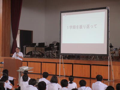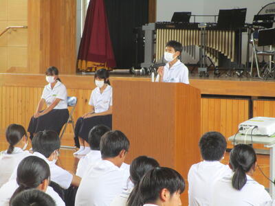 式では、各学年代表生徒による1学期を振り返っての発表がありました。それぞれに、よく考えられた素晴らしい発表でした。