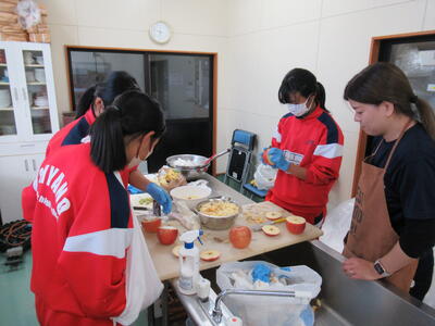 裏の調理室をお借りした製作チームは、おやつ家 華音、高月さん指導の下、盛り付け作業を必死に頑張っていました。