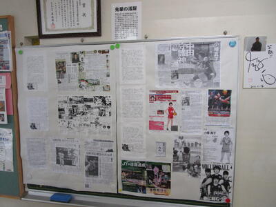 関西大矢野会という関西で活躍されている大矢野出身の方々の会があります。その会長を務められ、現在相談役をされている嘉悦さんという大先輩がいらっしゃいます。定期的に大矢野中学校の卒業生の活躍が掲載された新聞・雑誌などの切り抜きやコピーなどを学校に送っていただいています。現在、職員室前の廊下に張り出して紹介しています。