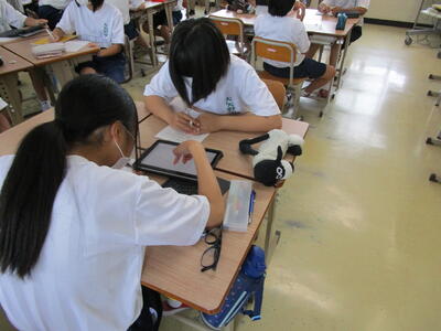 「who am I?」などのクイズを作るために、誰にするかを考え、タブレットを使って画像などを探していました。班での活動に熱心に取り組んでいました。