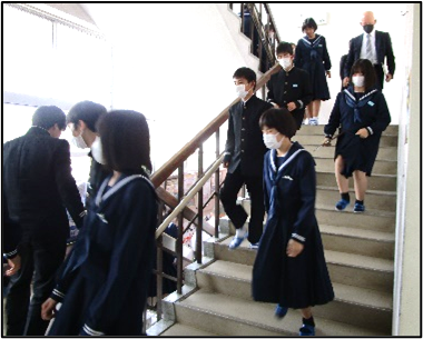 今回の訓練は、地震発生を想定し、机の下へ、そして、運動場へ避難しました。そして、津波警報を想定して、さらに高い城山のテニスコートまで避難しました。ほとんど私語もなく、整然と避難し、係の西田先生の話を聞いていた生徒の態度も立派でした。