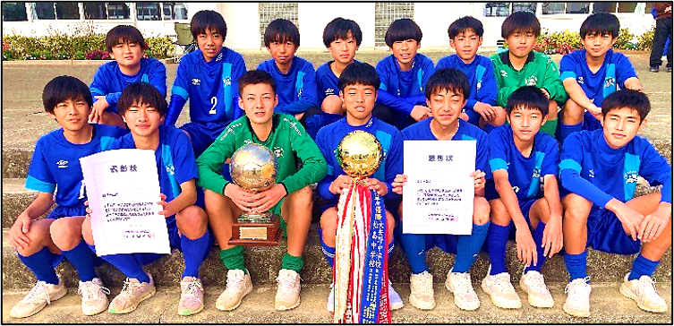 サッカー部が、松島中学校との合同チームで、天草郡市の田嶋幸三杯で、苓北五和合同チームや本渡中学校などに競り勝ち、見事に優勝しました。キャプテンの篠田琉矢さんは、「苦しい場面もあったけど、あきらめずに戦えたのが良かった。日頃から声をかけあって考えた練習をし、春の久々山杯でも優勝したい。」と語りました。