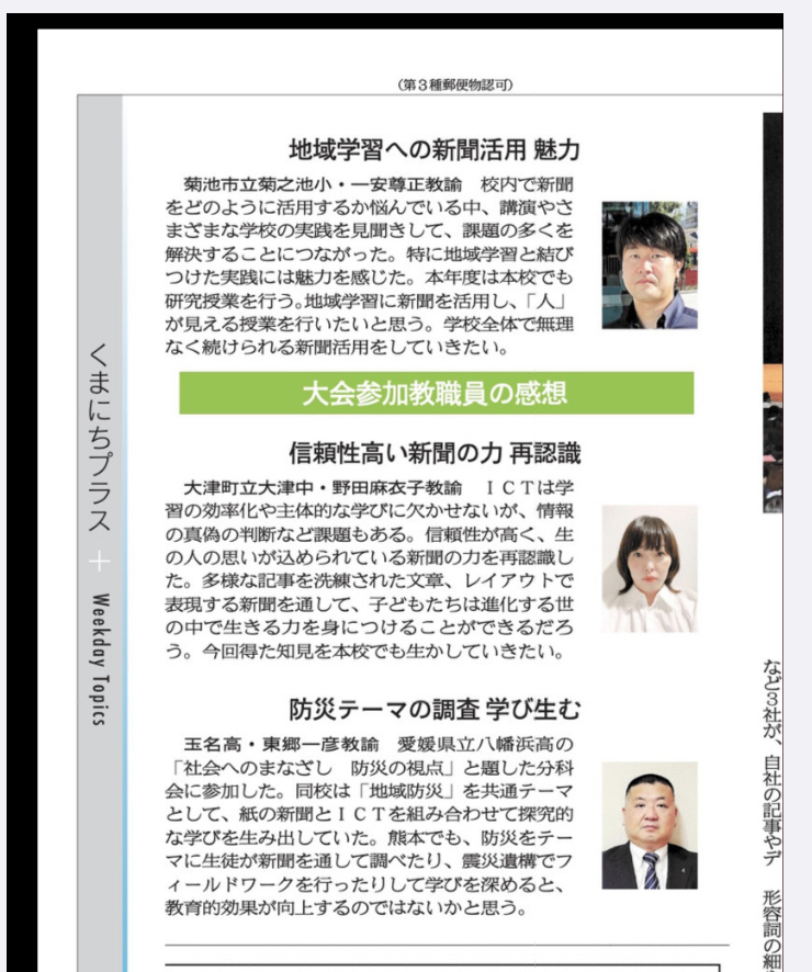 本校は「NIE(News In Education=教育に新聞を)」の実践指定校に認定されています。8月に全国大会が行われ、野田先生が参加されました。その模様が、8月29日付けの熊本日日新聞に掲載されましたので紹介します。