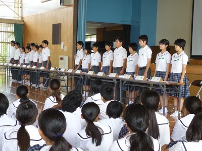 本日の放課後、体育館にて明日から始まる中体連大会の激励会が開催されました。各部活動のキャプテンが大会に向けての抱負を発表しました。3年生にとっては最後の大会です。それぞれの選手がベストを尽くし、活躍してくれることを願っています。