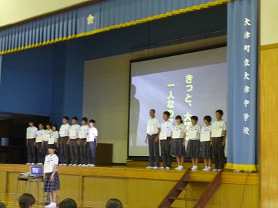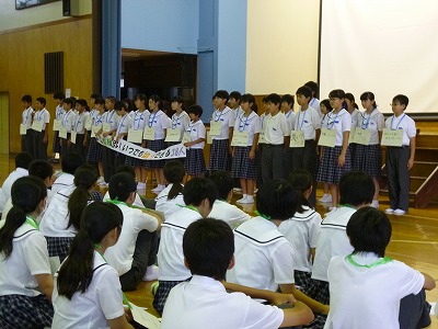このシンポジウムでは、本校を含め県内の5つの中学校生徒代表により、これまでのシンポジウムで協議、作成した「熊本県いじめを許さない宣言文」、「熊本県いじめを許さない行動計画」をもとに、各学校において実践した具体的な取組を振り返るとともに、児童生徒と教職員、保護者や地域住民等とが「心のきずな」を深め、一体となっていじめを許さない学校、学級づくりに取り組む基盤となる「心のきずなを深める5か条」を協議し、作成しました。