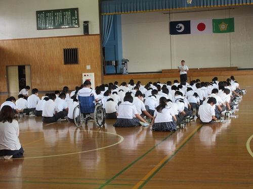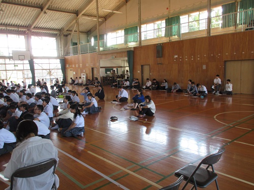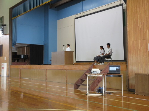 1年生代表からは、頑張ったこととして、勉強の方法、部活動、英語暗唱について、2年生代表からは、印象に残ったこととして、人間関係の克服、社会科の克服、人権作文について、3年生代表からは部活動について、生徒会からは充実していた前期について話がありました。