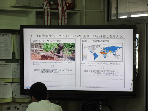2年1組では、長野正樹先生が「一次関数」の単元で、銅銭糖の購入について「どのプランを選んだ方が、年間にかかる料金は安くなるか。」という内容でした。