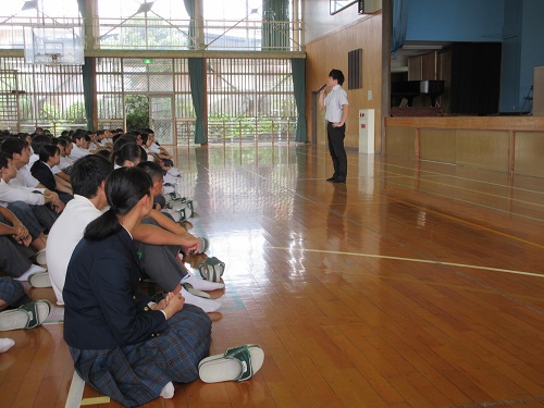 そのあと、生徒指導からは、登下校中の自転車の乗り方や制服の移行期間の着方についてお話がありました。長野正樹先生のつかみの話は、いつも面白い。