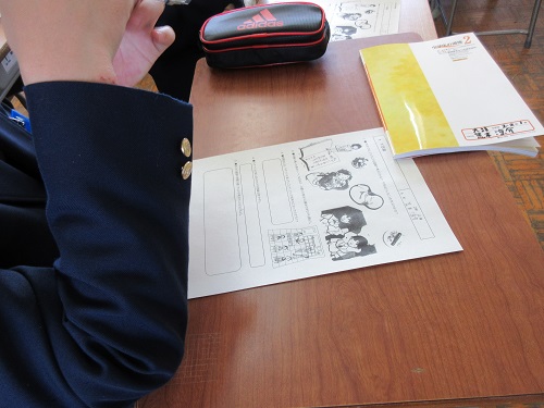 今回は、県教育委員会作成の『平成28年度熊本地震関連教材 つなぐ ~熊本の明日へ~ 中学校版』を使っての授業でした。