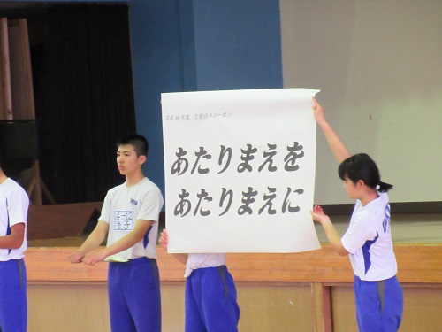 式のはじめに、生徒会の本年度のテーマ「あたりまえを あたりまえに」が発表さ