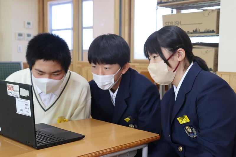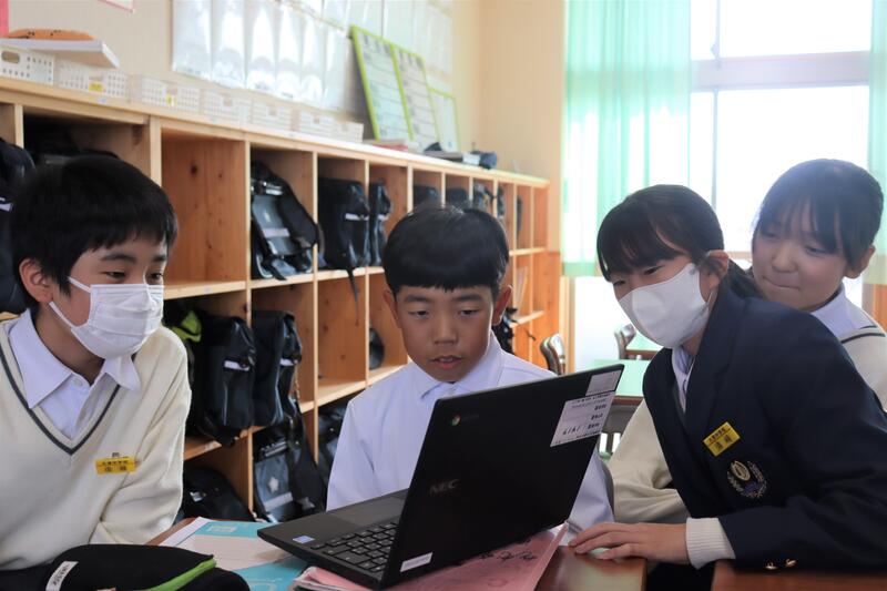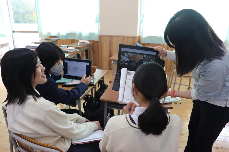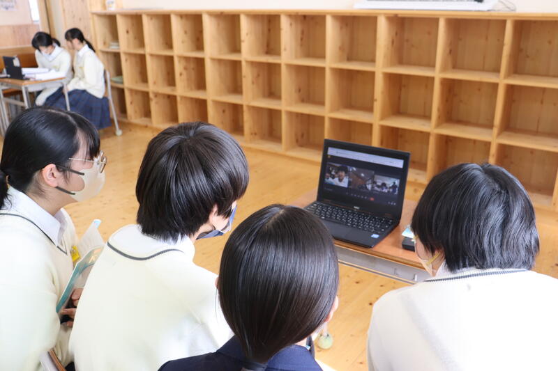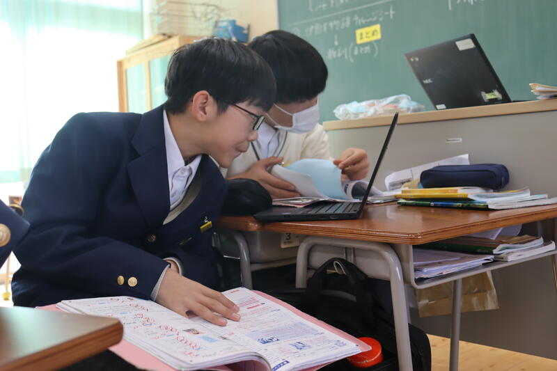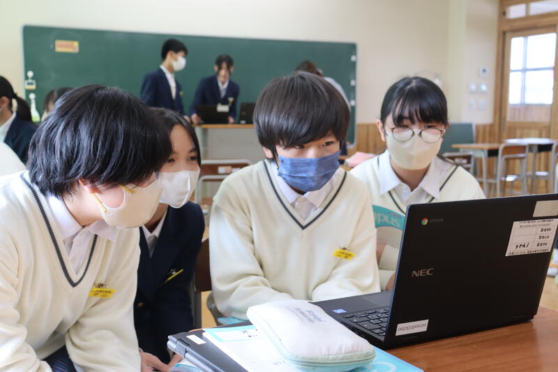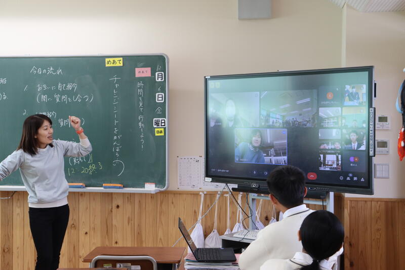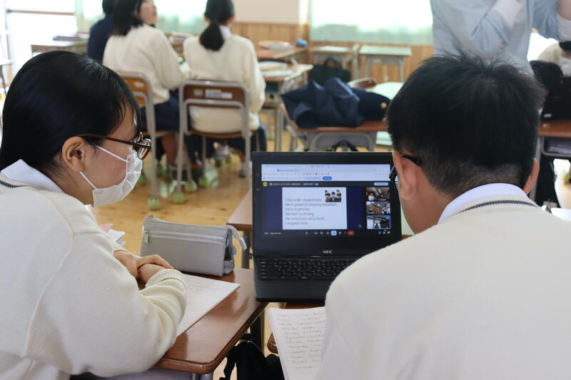 現在、1年生の英語の授業では熊本市内の桜木中学校との遠隔交流授業を行っています。英語科の梅北先生のお知り合いの先生がいらっしゃるということで、1年生同士の交流が実現しました。タブレット越しに自己紹介をした後、各グループの人物紹介や学校行事の説明などを英語で伝え合いながら、コミュニケーションを深めました。はじめは緊張した面持ちでしたが、いざやり取りが始まると身を乗り出して積極的に質問する姿も見られました。英語科の目標では「日常的な話題について、簡単な語句や文を用いて伝えたり、相手からの質問に答えたりすることができる」とあります。授業後に「もっと英語で伝えられるように、授業をがんばりたい!」という感想も聞かれ、子どもたちの「主体的な学び」につながる授業でした。今後、全クラスで実施予定です。