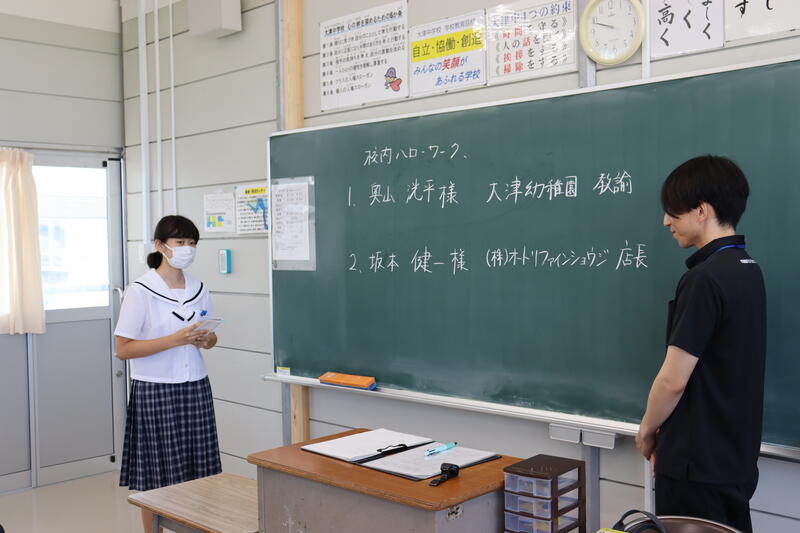 校内ハローワークには、①身近な職業人のお話を直接聞くことによって、自己の生き方を考える。②中学生として今、何を学ぶべきなのかを見つめ直す。という目的があります。各クラスとも一生懸命に話を聞き、熱心に質問する姿が見られ、目的は十分達成できたと考えます。講師の皆様がたには、大変お世話になりました。今後とも大津中学校をよろしくお願いいたします!
