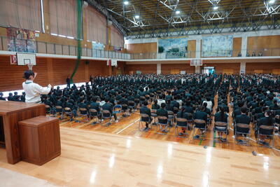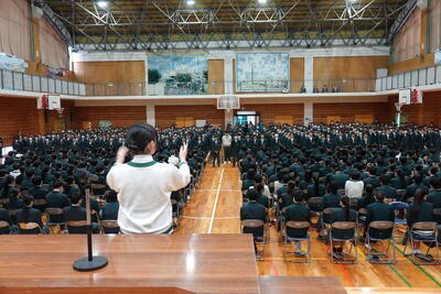 本日、「3年生を送る会」を行いました。3年生修了式後、1、2年生がサプライズで体育館に入場。これまでの3年生との思い出や感謝の思いを歌に込めて、全員で「旅立ちの日に」を合唱しました。途中、生徒会を中心とした代表生徒が呼びかけを行い、3年生への思いを伝えました。1、2年生の皆さん。ありがとうございました。