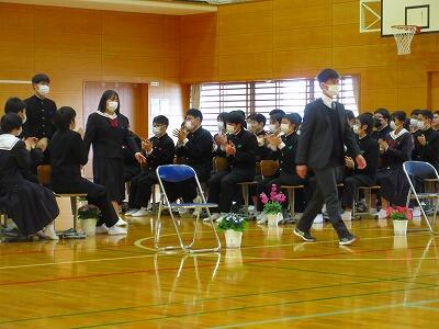生徒会任命式の様子です。平井生徒会長から土井生徒会長へ生徒会長という襷が渡されました。特に3年生の生徒会役員の皆さん、委員長・副委員長の皆さん、1年間お疲れ様でした。