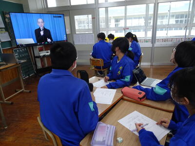 しごと学び WEB ライブ ! 働く人の話から学ぶ 投稿日時 : 2023/01/26 作成者1 カテゴリ:2年生 1月24日の5・6校時に「しごと学びWEBライブ」が実施されました。 魚が食卓に届くまでにどのような仕事があるのか、「働く人」と「稜南中」をオンラインでつないで話を聞いたり、質問をしたり、活動的な時間となりました。 生徒の皆さんは、チャット機能を利用してたくさんの質問をしていました。働いている方の「リアルな声」に、共感したり、意外に感じたりと気づきも多かったようです。 最後の感想では、2名の生徒がカメラの前で発表しました。「仕事」について真剣に考える機会となったようです。