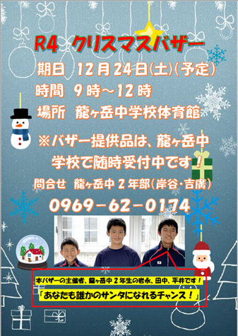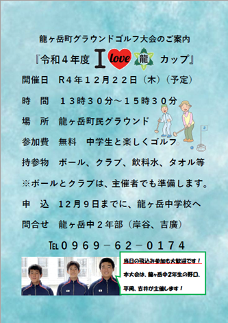 盛り上げ隊は、12/22(木)にグラウンドゴルフ大会=ILOVE龍カップを企画しています。よかもん売り隊は、12/24(土)にクリスマスバザーを企画しています。たくさんの方のご参加をお待ちしています。