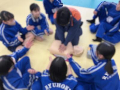 2月10日(火)、5・6校時に2年生の保健の授業で、救急救命講習を行いました。講師の消防士の方々の説明を聞き、人形を使って心肺蘇生法の技能を中心に学びました。いざという時には、救急車が現場に駆けつけるまでには時間を要します。その間、傷病者の悪化を防ぐためにとても大切です。2年生は、その目的を理解し真剣に取り組んでいました。