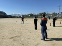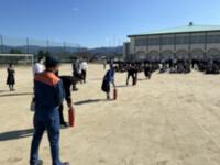 運動場に避難して消防署の方の話を聞き、消火(水消火器)訓練を行いました。