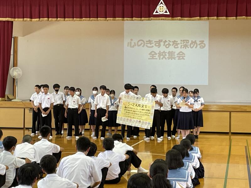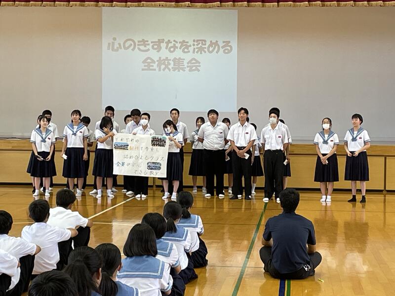 9/15(金)に人権集会を行いました。これまでに各クラスで学活や道徳の時間に、人権問題、いじめ問題について考えました。授業の中で、一人ひとりから様々な意見が出され、私たちが楽しく毎日を過ごしていくためには何が大切か再確認しました。その意見を元に各クラスで今後、守っていく人権宣言を決め、紹介し合いました。各クラスのカラーが出た素敵な宣言を作ることができました。これから、お互いに声を掛け合って、相手のことを考えて行動できるよう意識するとともに、定期的に振り返りたいと思います。