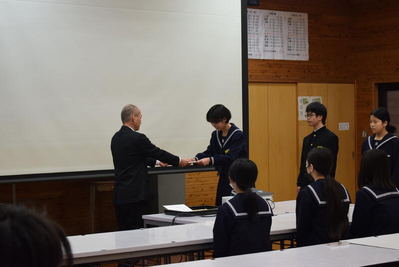 今日は、八代地区科学発明工夫展で奨励賞を受賞した2年生のS・Aさん、M・Mさんと、熊本県スペシャルトランポリン交流大会で3位になった2年生のY・Kさんの表彰をしました。おめでとうございます。これからもいろいろなことにチャレンジして、自分の可能性を広めてほしいです。