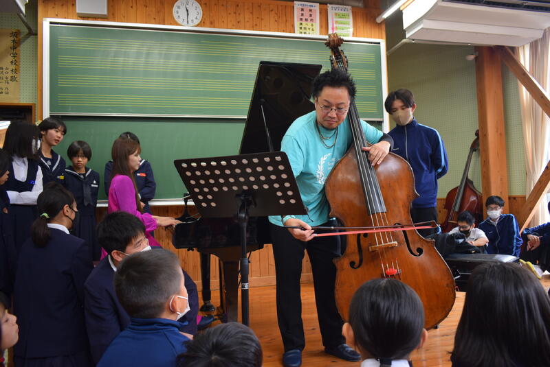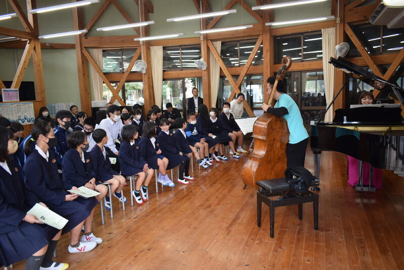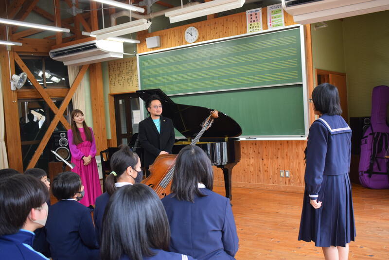 今日は「演奏家派遣アウトリーチ事業」がありました。これは、プロの演奏家が学校を訪問して、生の演奏を披露するという取組です。八代市が主催して毎年いくつかの学校で行われています。今年は運良く坂本中が選ばれました。大分のオーケストラ「RENTARO室内オーケストラ」の森田さん(コントラバス演者)と室屋さん(ピアニスト)がすばらしいコントラバスとピアノの演奏と楽しいお話を聞かせてくださいました。貴重な体験となりました。