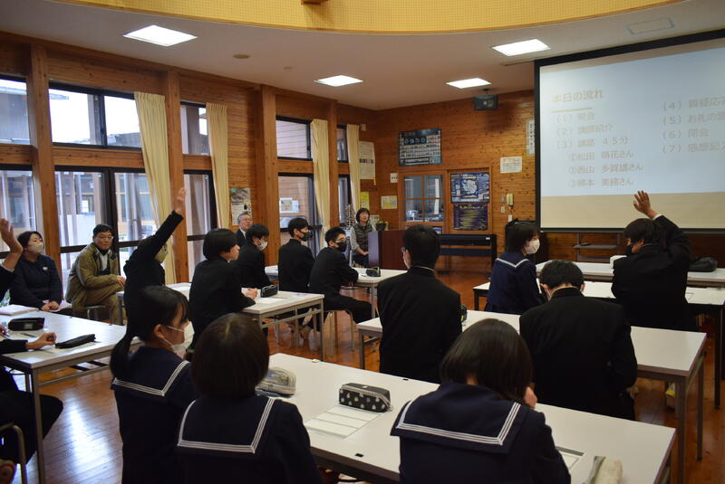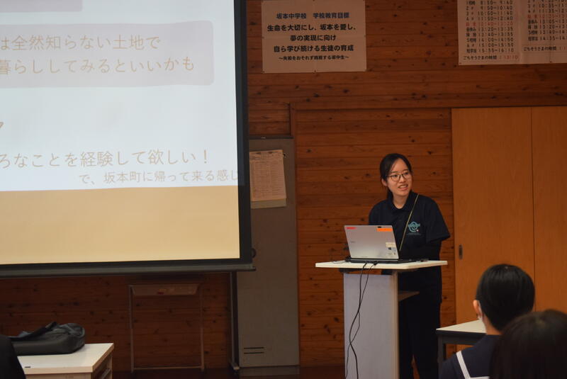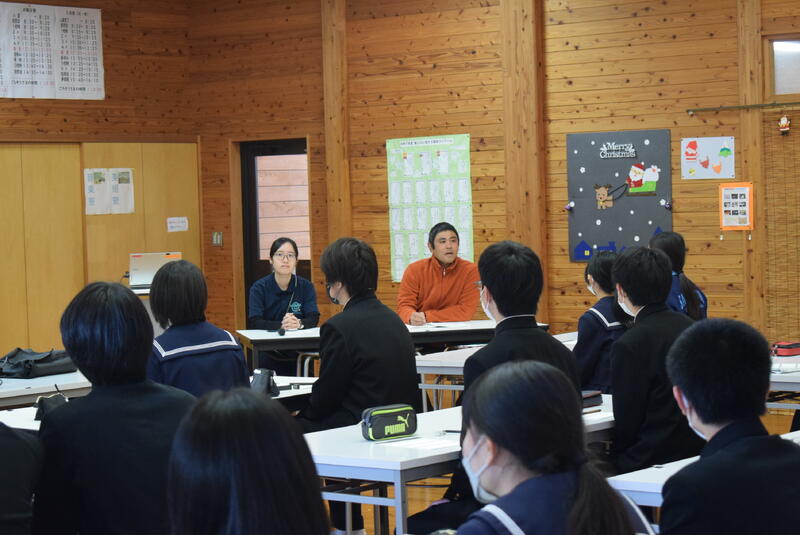 坂本に来られる前の経歴や坂本に来られたきっかけ、現在の仕事、坂本の魅力などについて話をしていただきました。生徒たちからもたくさんの質問にも本音で答えていただきました。生徒は坂本の魅力について再発見し、これからの生き方につなげていこうという気持ちが高まったようです。