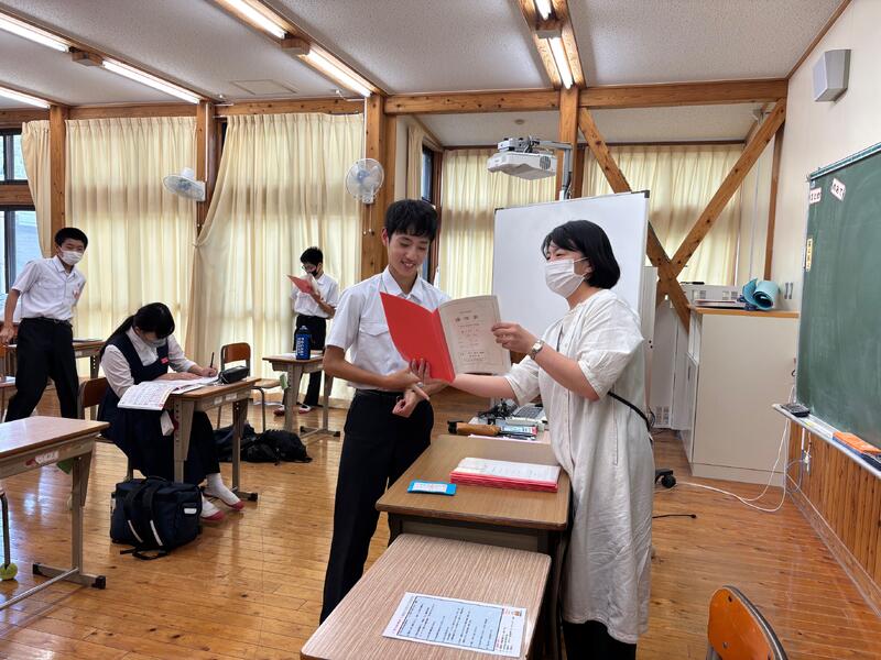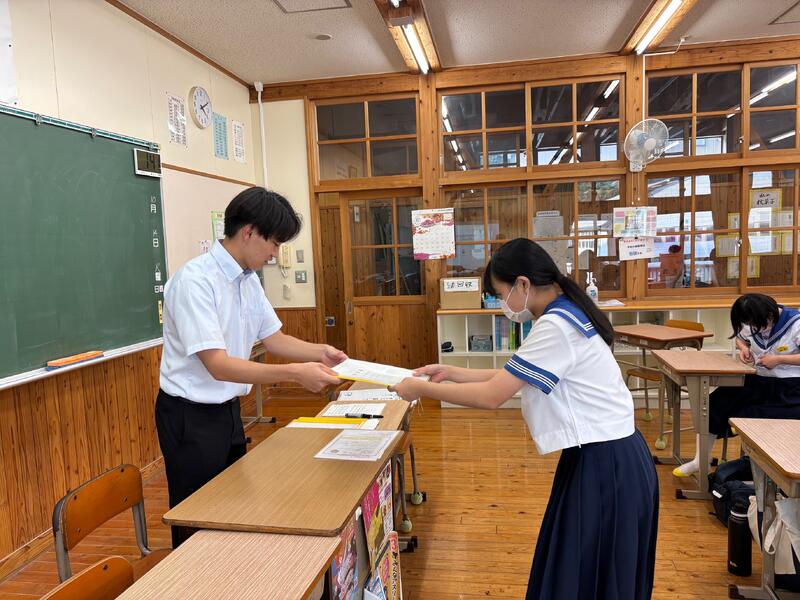 今日、各学級で前期の通知表が渡されました。生徒たちは少し緊張した様子で担任の先生から通知表を受け取っていました。2年生担任のY先生は、初めての通知表の作成でした。この通知表を見て、自分の成果を確認し、次の目標を立てるきっかけになればいいです。
