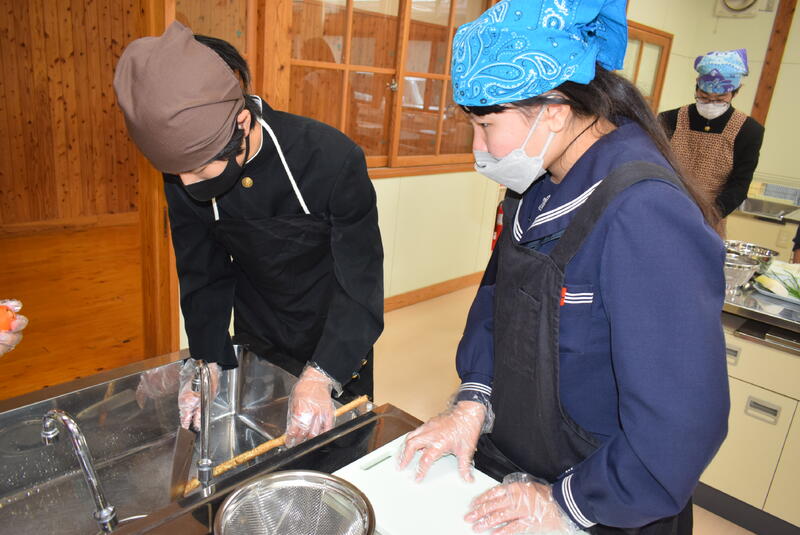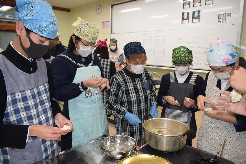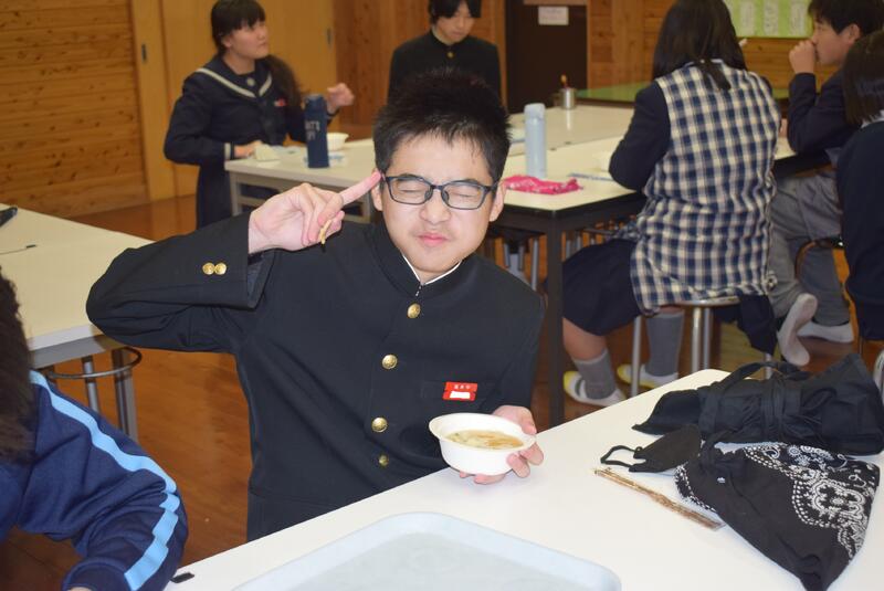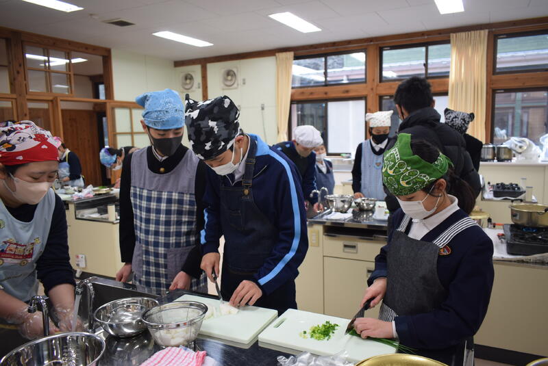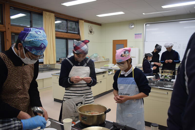 今日は郷土料理教室がありました。3年生が八竜小学校の5.6年生と一緒に「だご汁」作りに挑戦しました。今回も坂本町生活研究グループ連絡協議会の皆さまにご指導をいただきました。いつもありがとうございます。今日は具材に「しいたけ」ではなく鶴喰産の「きくらげ」を使ってありました。歯ごたえがありとてもおいしかったです。たくさんできたので、全校生徒・職員でいただきました。3学期は2年生が「ばたもち」作りに挑戦する予定です。