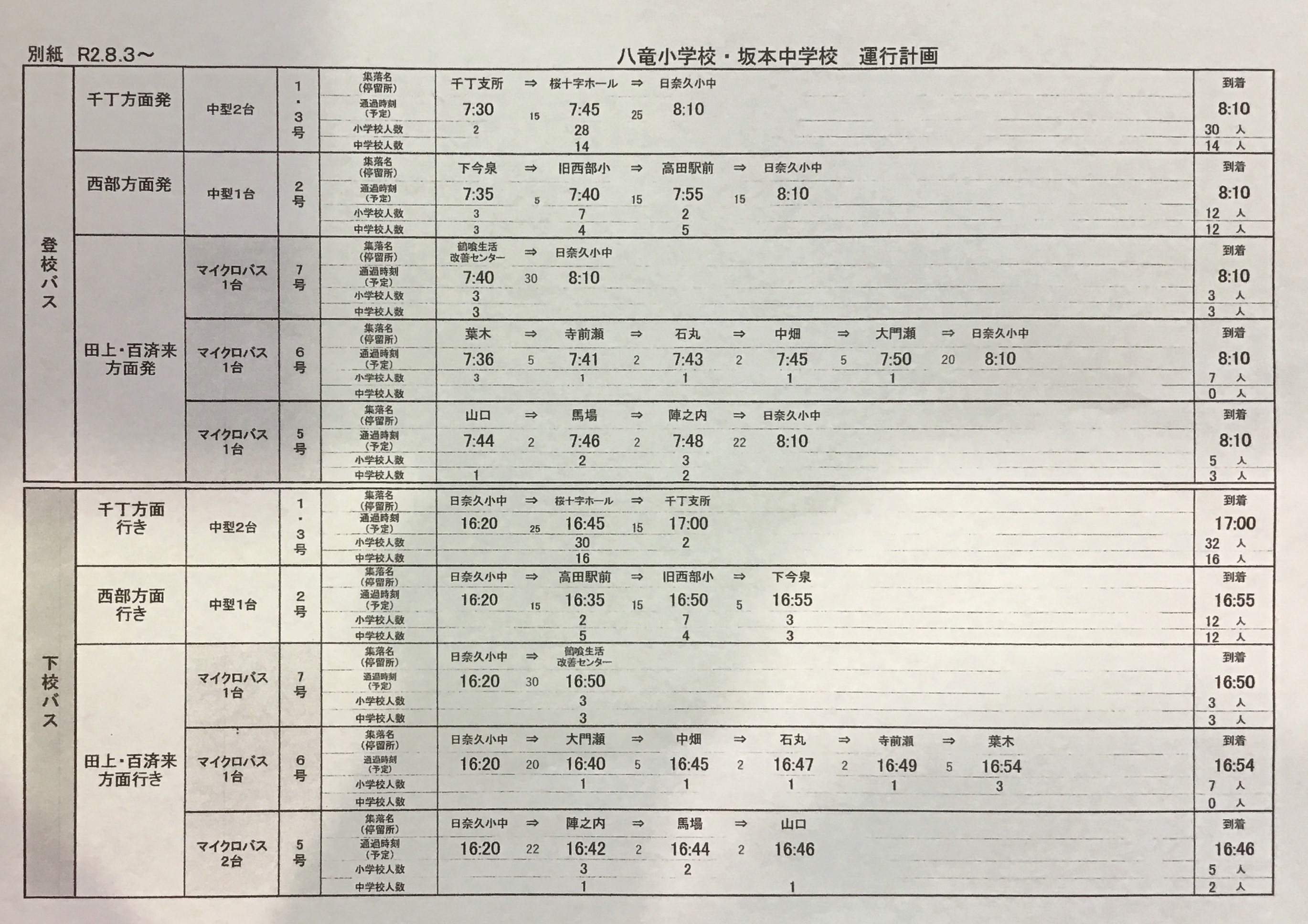 保護者の皆様へ(7月17日) 投稿日時 : 2020/07/17 学校サイト管理者 保護者の皆様へ(7月17日) 「学びの場」の輸送計画を変更いたしました。 7月20日(月)から時間帯が変わっている場所がありますので改めて ご確認ください。 学びの場 バス運行表(R2.7.20~).pdf