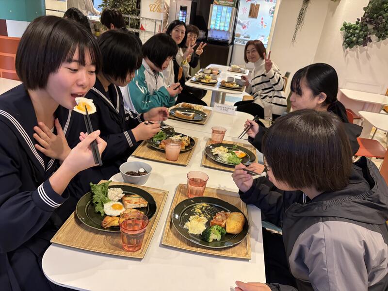 おはようございます。2日目の朝です。今日は通勤ラッシュの中、京都へ向かいます。まずは腹ごしらえ。みんな元気です。