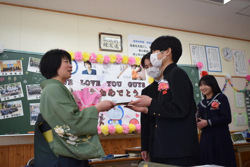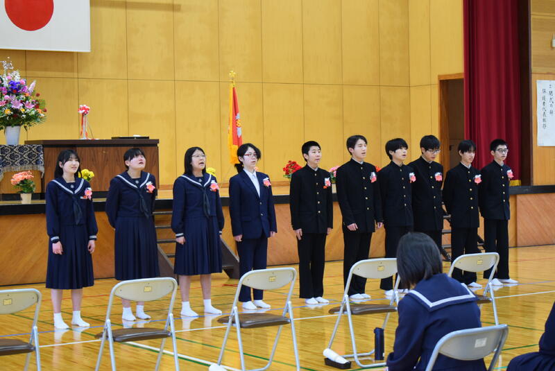 本日、第51回卒業証書授与式を挙行し、10名の3年生が坂本中学校を巣立っていきました。卒業生一人一人が堂々とした姿で卒業証書を受け取る姿からは、これまでの学校生活で積み重ねてきた努力と成長が感じられました。坂本中学校で過ごした日々が、これからの人生を支える大切な土台になることを願っています。