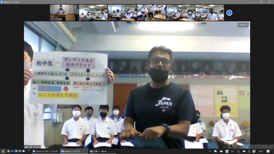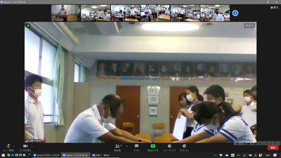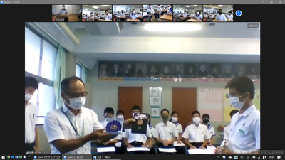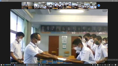 感染対策を考慮し、オンラインで各クラスをつなぎ全校集会を開きました。今回は、先日実施された郡市中学校総合体育大会陸上競技大会、他各種大会で入賞した生徒の表彰と、陸上大会を総括して後藤先生より講話をしてもらいました。