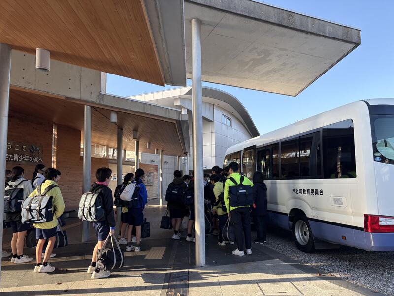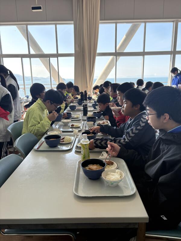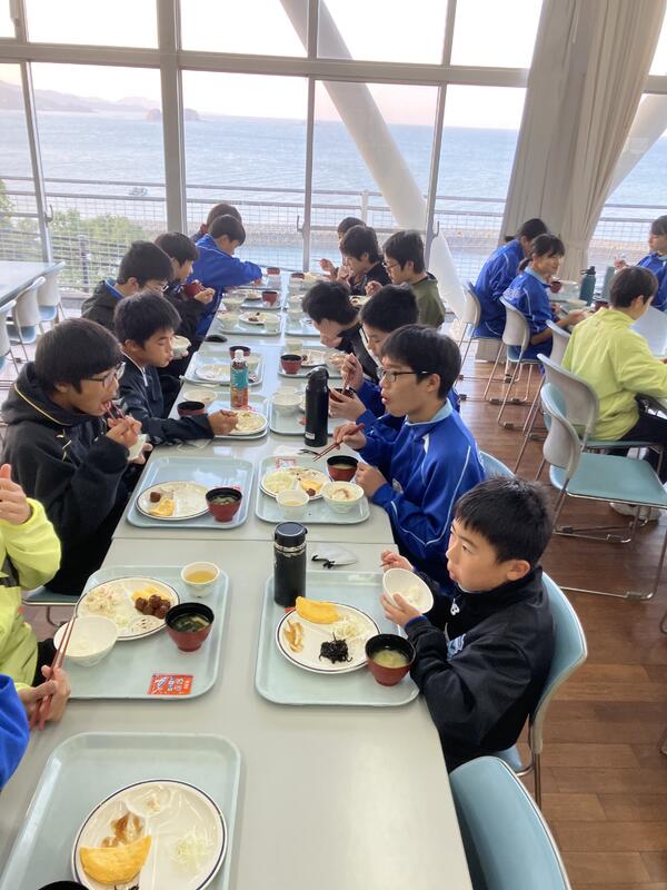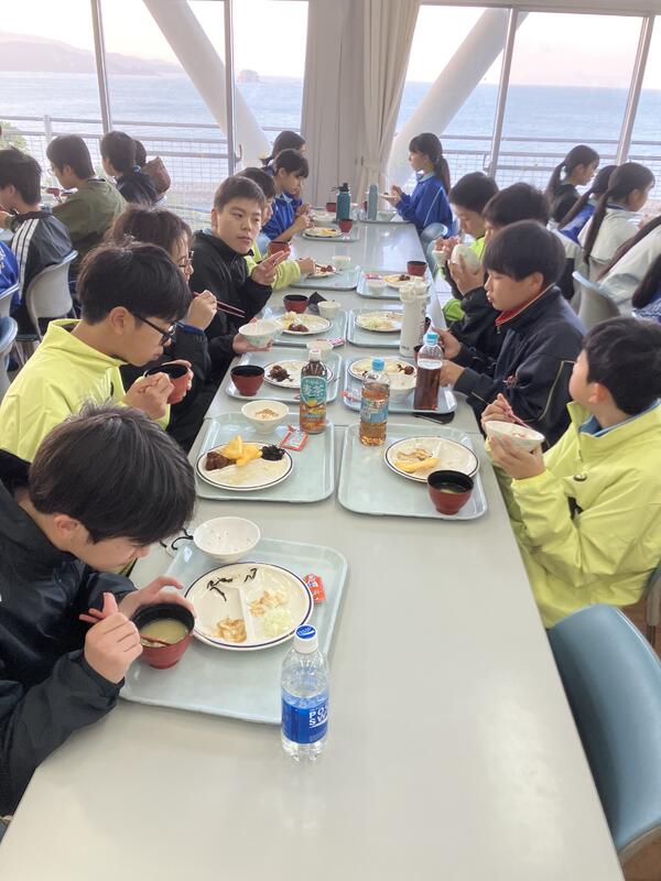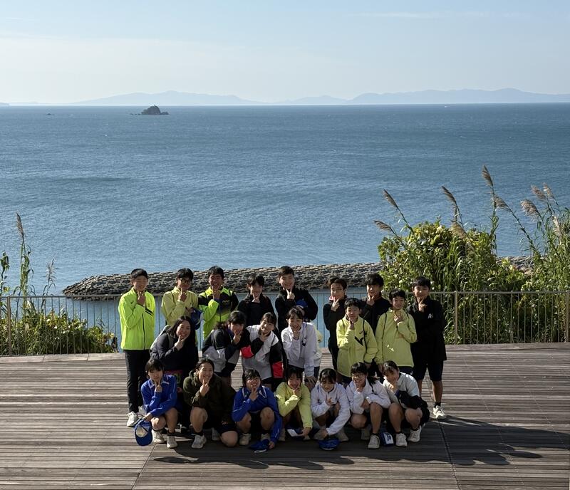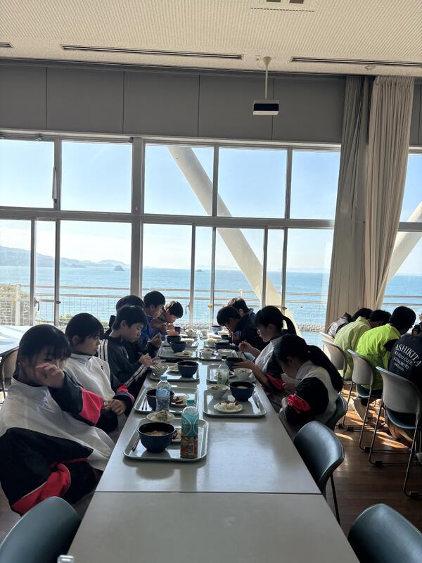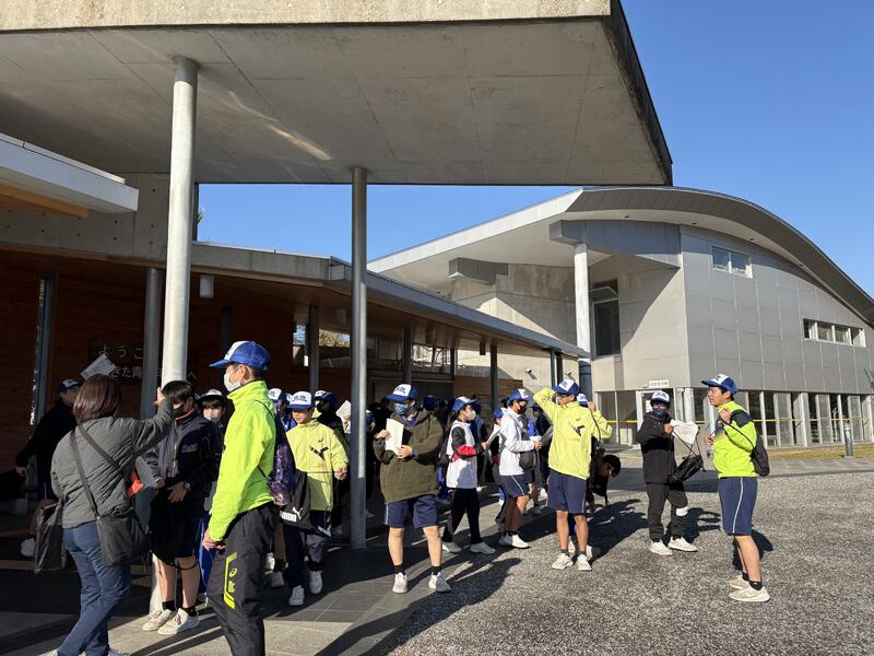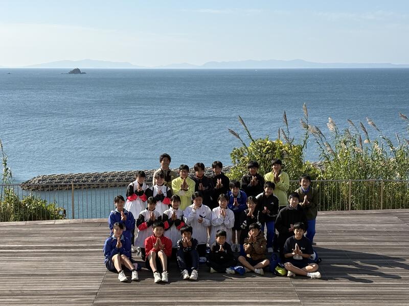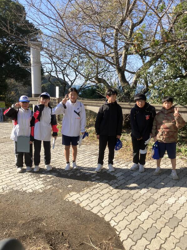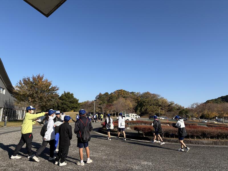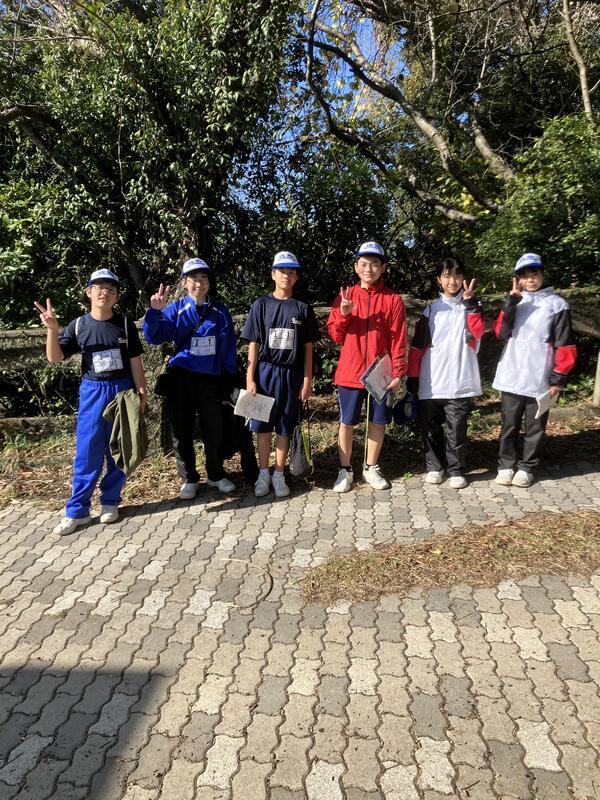 晴天の中、班で協力しながら、ビンゴオリエンテーリングがんばっています。芦北のきれいな景色を見ながら楽しそうに取り組んでいます。