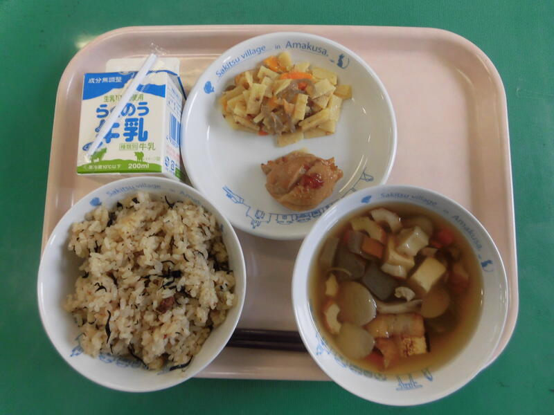 牛乳 ひじきごはん つぼん汁 照り焼きチキン たけのこのひこずり
