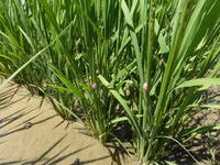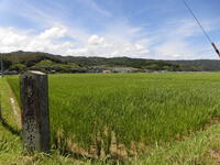 昨日、九州北部の梅雨明けが発表され、一層、気温も上がってきましたが、学校田の稲も写真のように順調に育っています。(穂が出てきている株も見られました)また、タニシが卵を産み付けていて少し気になります。
