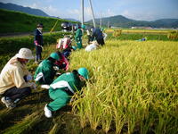 8月10日に熱中症対策のため、早朝7時から集合して学校田の稲刈りをしました。最初は慣れない手つきでしたが徐々に効率もよくなり作業を終えることができました。参加したみなさん、本当にご苦労様でした。