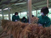 8月17日に、干していた稲の脱穀を行いました。盆前後の雨の影響で乾きが悪かったため、15日に学校田から本校自転車小屋に稲を移し干していたため、脱穀も自転車小屋で行いました。担当の3年生の頑張りで予定していた作業もどうにか終えることができました。3年生の皆さん、そして御協力いただいた地域の皆様、本当におつかれさまでした。収穫量は、後日お知らせいたします。