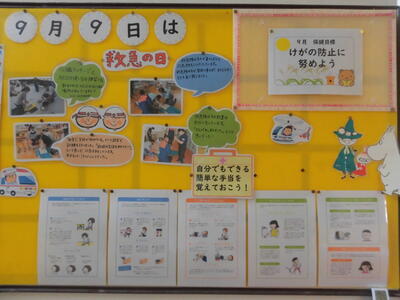 本日、9月9日は、「救急の日」となっています。本校でも下の写真のように「緊急時」の対応等を含めた保健コーナーの掲示で情報発信を行いました。また、夏休みには、消防署の署員の方を講師に迎え、職員対象の「救命講習」等も行いそのときの様子も掲示の中で知らせています。まずもって、そのような緊急対応に至らない日頃の対策に力を入れていきたいと思います。