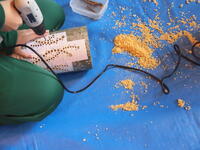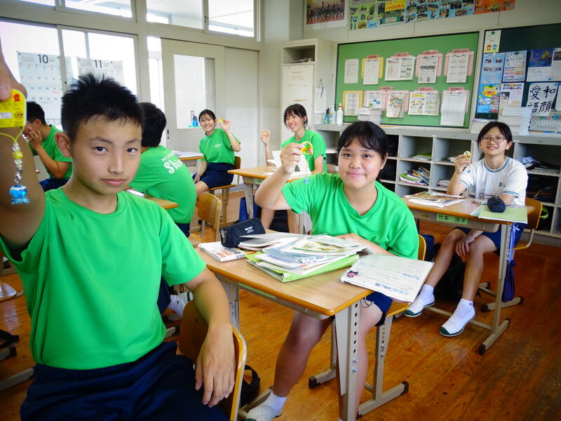 先週、台風で臨時休業になる前に、新和町商工会議青年部の舩本さん方が、3年生用に毎年恒例のタコストラップを持ってこられました。