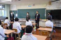 10月25日(金)の午後、本年度第1回目の6年生体験入学を実施しました。 オリエンテーションの校長挨拶の中で、小中学校の3つの違い「①空間の違い(教室の雰囲気、3階建て、移動ルートなど」「②50授業分(5分長い)」「③教科担任制(担任の先生はいます)」を感じてみてくださいという話をしました。 その後、体育館で、体育の武道の授業を体験しました。剣道の授業であり、「正座」「礼」「すり足」「左座右起」などの話を聞いたり実際に行ったりました。また、竹刀も扱い素振りも体験することができました。