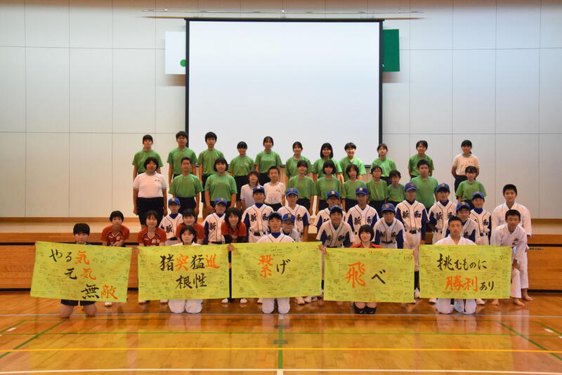 昨日、天草郡市中体連夏季大会選手推戴式を体育館で行いました。はじめに各部キャプテンからの決意表明そして校長先生からの激励の言葉、選手代表の誓いの言葉、応援旗の授与、生徒代表の激励の言葉、モチベーションアップのために職員がつくったDVD視聴、大きく広がっての円陣等、盛りだくさんの内容でした。最後に係の先生からのまとめで終了しました。今週末の土曜日から大会が始まります。新和中生の活躍を期待しています。ファイト!