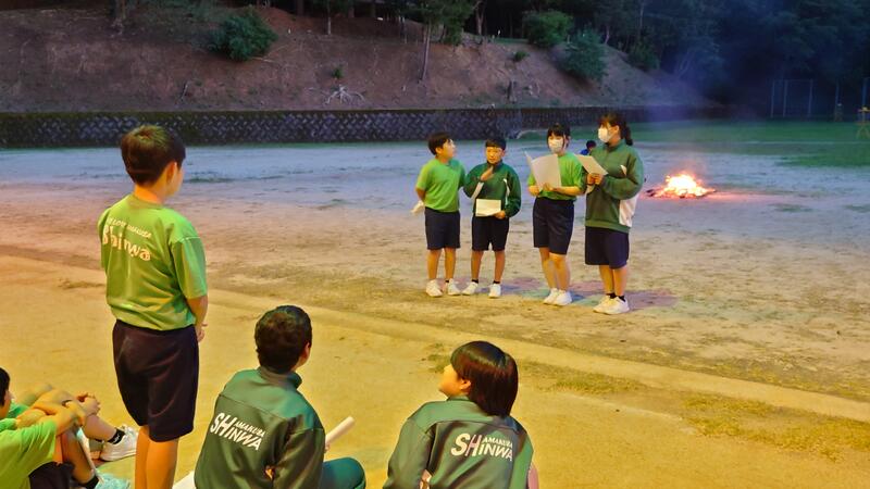 5月29日(水)~30日(木)の2日間、1年生は松島の青年の家に集団宿泊教室に行っています。昨日29日(水)は夕方7時からキャンプファイヤーやレクリエーションを行いチーム新和1年の団結力を高めることができました。各班の出し物やレクリエーションはとても工夫され盛り上がっていました。