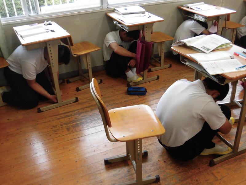 県下一斉の熊本シェイクアウト訓練は、10月5日(土)に行われましたが、本校では本日11月1日(金)に校内で独自に訓練を実施しました。「生徒の防災意識や自助力の向上を図る。」を目的に、2分程度の短い訓練ですが、以下の3つの安全確保行動をとる訓練確認をしました。
