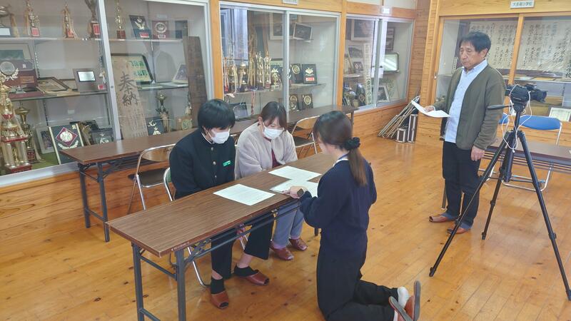 その放映内容の収録を1月11日(木)新和小学校にて、天草市教育委員会生涯学習課の担当の方と小中学校の担当等で行いました。本校からは、山中推進員、校長、田中先生、3年生生徒の濱本さんの4人が出演します。