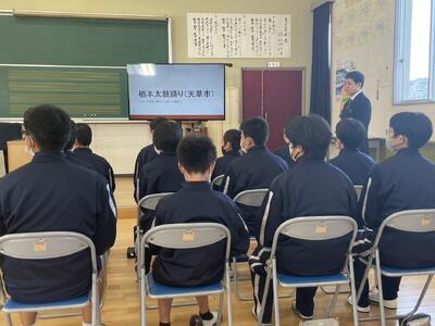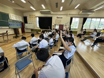 9月25日(木)に栖本太鼓の講話がありました。栖本太鼓の発祥や、どのようにして受け継がれてきたのかを地域の方に学びました。生徒の振り返りでは「これまでに多くの人が栖本町や太鼓を継承するために様々な工夫をしてきたことを知って僕も授業などで太鼓練習して伝統を受け継げるように頑張ろうと思いました。」等伝統を受け継ごうとする意欲を高めていました。