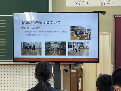 9月25日(木)に栖本太鼓の講話がありました。栖本太鼓の発祥や、どのようにして受け継がれてきたのかを地域の方に学びました。生徒の振り返りでは「これまでに多くの人が栖本町や太鼓を継承するために様々な工夫をしてきたことを知って僕も授業などで太鼓練習して伝統を受け継げるように頑張ろうと思いました。」等伝統を受け継ごうとする意欲を高めていました。