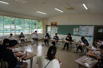 「交流給食」では、各学年の生徒が数人ずつ他の学年に移動し、学年をシャッフルした形で給食を食べました。