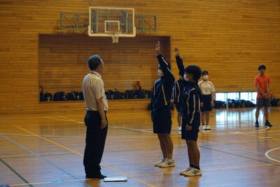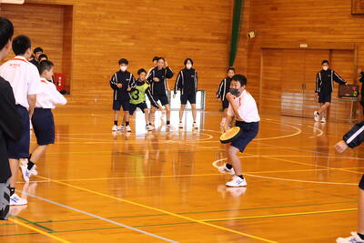 後半は、最初に全校生徒一人一人の自己紹介があり、各学年で個性を発揮していました。その後、生徒会執行部考案のレクリエーション「王様あてドッジビー」を行いました。学年対抗戦も団対抗戦も大盛り上がりで、楽しんでいる姿が見られました。